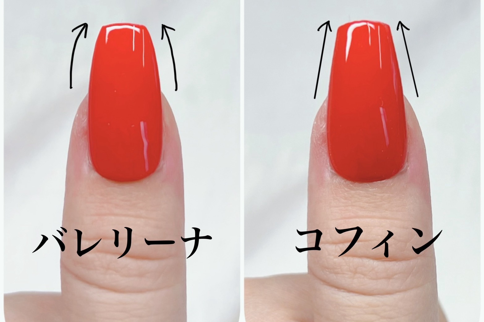 ・バレリーナネイル…バレリーナが履くトゥシューズのように、爪の先端に向かって細くなり、爪先が平らな形を言います。 ・コフィンネイル…英語で「棺(coffin)」を意味する言葉に由来しており、爪の先端に向かって細くなり、爪先が平らな形を言います。